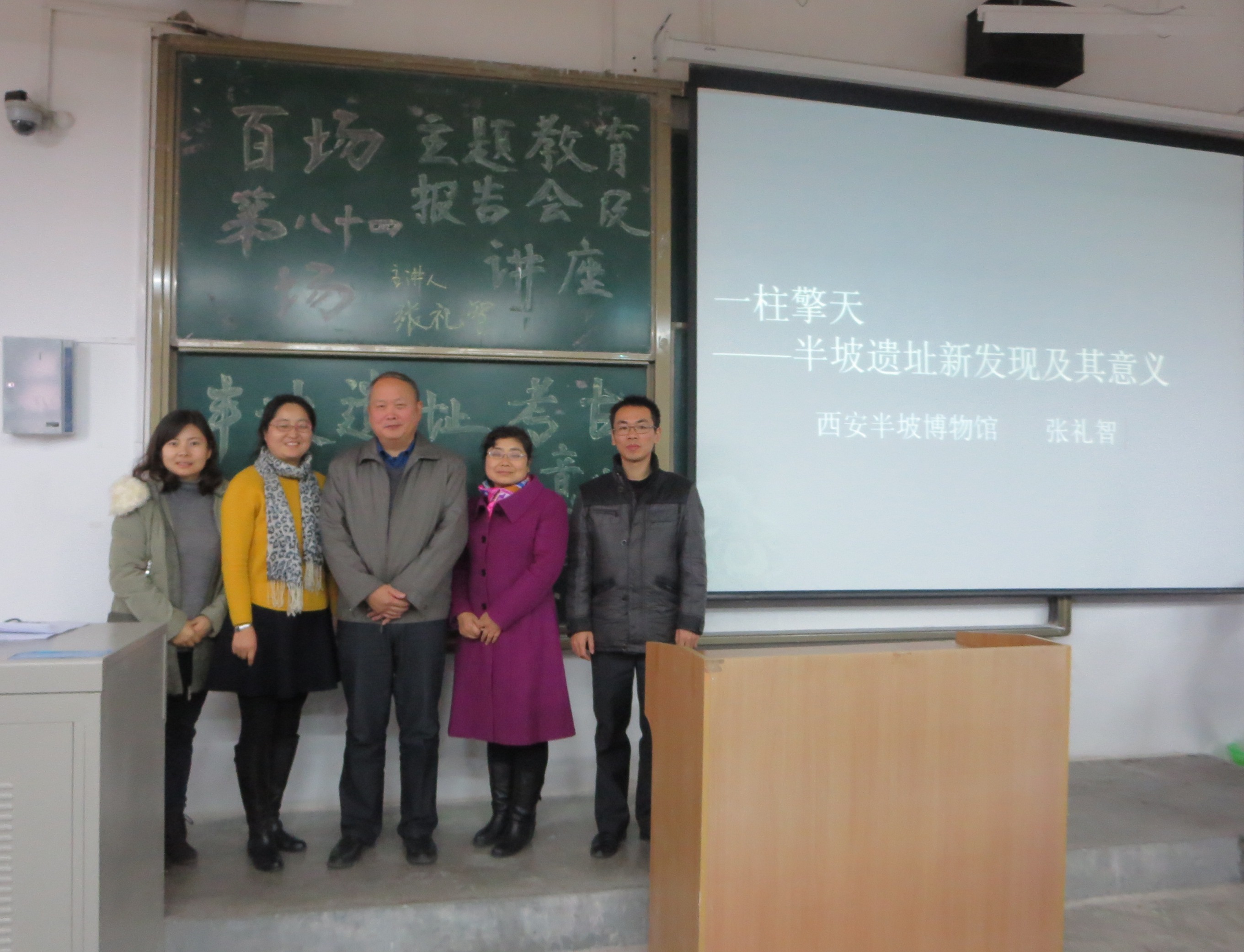讲座伊始,张礼智向大家介绍西安半坡博物馆建馆历史,他强调西安半坡博物馆是中国第一座史前聚落遗址博物馆,在世界上开创了在遗址上修建场馆的先河。接着,张馆长图文并茂地向大家展现了这个距今大约6000多年的一处典型的新石器时代仰韶文化母系氏族聚落的社会生产工具、生活用具、艺术品、窑穴、陶窑、墓葬等遗迹的情况,生动地展现了半坡先民们的生产与生活情景。最后,张馆长向大家展示了半坡遗址的考古新发现“一柱擎天”,可能是当时聚落中的祭祀活动场所,这对半坡遗址的考古具有重要的研究价值。
