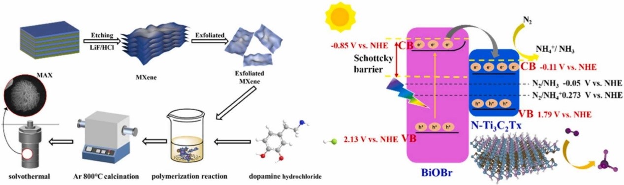 由于NH3的强N≡N键能、高电离能和较差的质子亲和力,在温和条件下合成NH3仍然是一个重大挑战。本研究采用盐酸多巴胺在Ti3C2Tx MXene表面进行原位聚合,随后,采用溶剂热法使N掺杂在Ti3C2Tx MXene表面原位诱导生长,制备了高比表面积、高折叠度的N-Ti3C2Tx MXene/BiOBr异质结。结果表明,BiOBr均匀地分散在N-Ti3C2Tx MXene表面。光催化氨产出率为270.73 μmol /g·h,是单独BiOBr的3.27倍,连续5次循环后仍能保持60%左右的产析出率。光催化机制是N-Ti3C2Tx MXene纳米片的高度分散和高导带电位促进电荷转移到纳米片的活性位点。本研究证明了盐酸多巴胺在太阳能利用MXene光催化材料中的潜在应用,此外,前期研究中在光催化NH3生产中,Bi4O5Br2锚定在具有欧姆异质结的Ti3C2MXene上,通过实验和理论计算相结合解析了光催化合成氨的机制(Journal of Colloid and Interface Science.2021,SCI一区, IF=9.965, Top期刊,2026世界杯官方合作网站为第一单位),为高效、低成本的Ti3C2Tx MXene合成氨光催化剂的潜在应用和理论价值研究提供了重要科学意义。