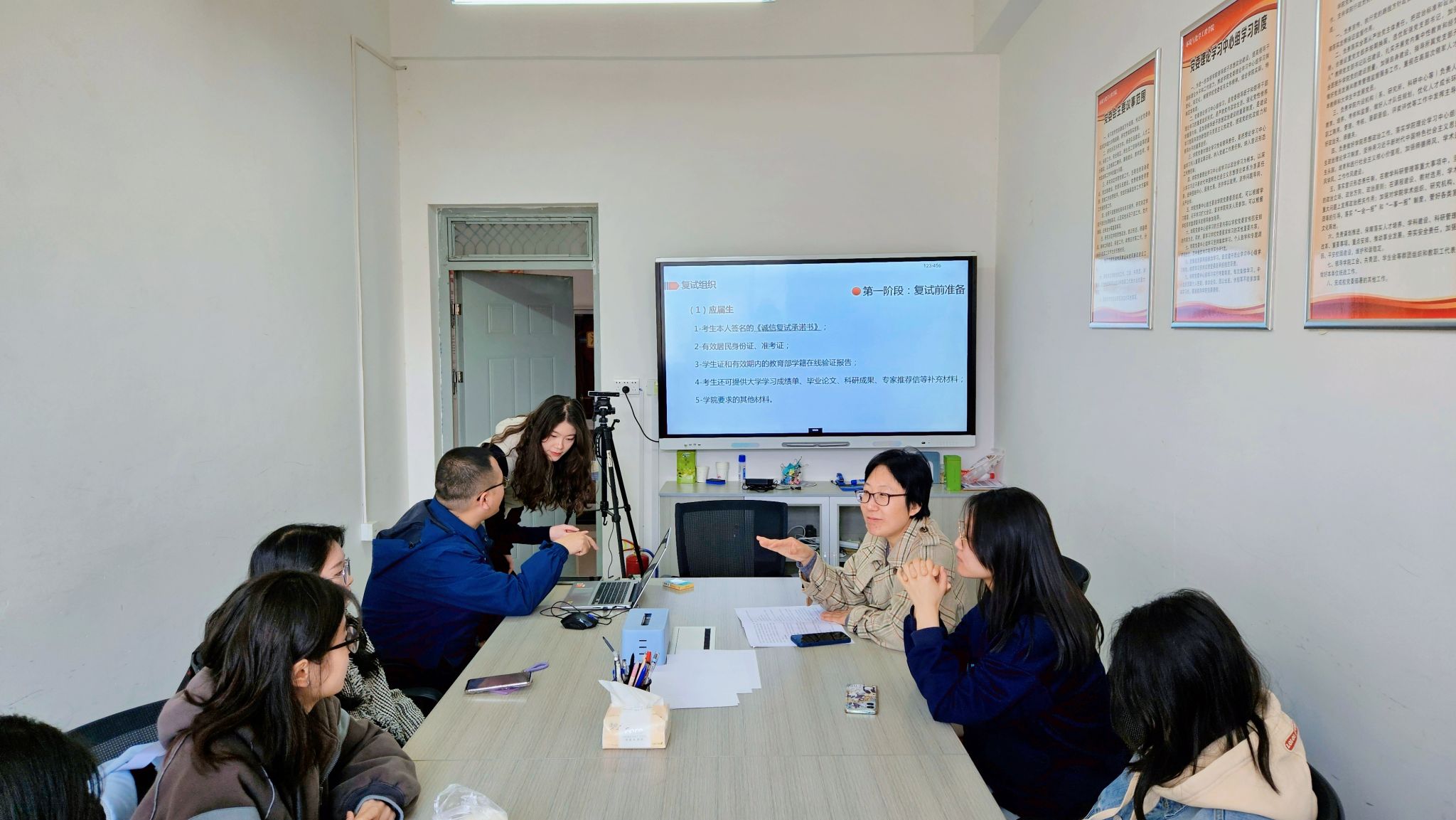 本次活动包括集体指导和面试模拟两个环节。武峥老师现场指导同学们关于考研面试方面的问题,就同学们存在的共性问题进行了全方面总结以及进一步的纠正,还与同学分享了一些实用的考场小贴士。武峥表示,复试前要从思想认识上高度重视,提前做好专业课、外语等内容的复习,要重点对专业相关的热点问题进行准备;复试中要放平心态、沉着冷静,与面试老师交流沟通时要注意礼貌和语速,用肢体语言与面试老师进行互动,要结合自身专业学习,突出自己的优势和闪光点进行陈述。他强调,要充分认识自身的现状,抓住调剂的有利时机,充分了解报考院校的招生意向及招生情况,确定适合自己的目标院校,积极准备,不轻言放弃。