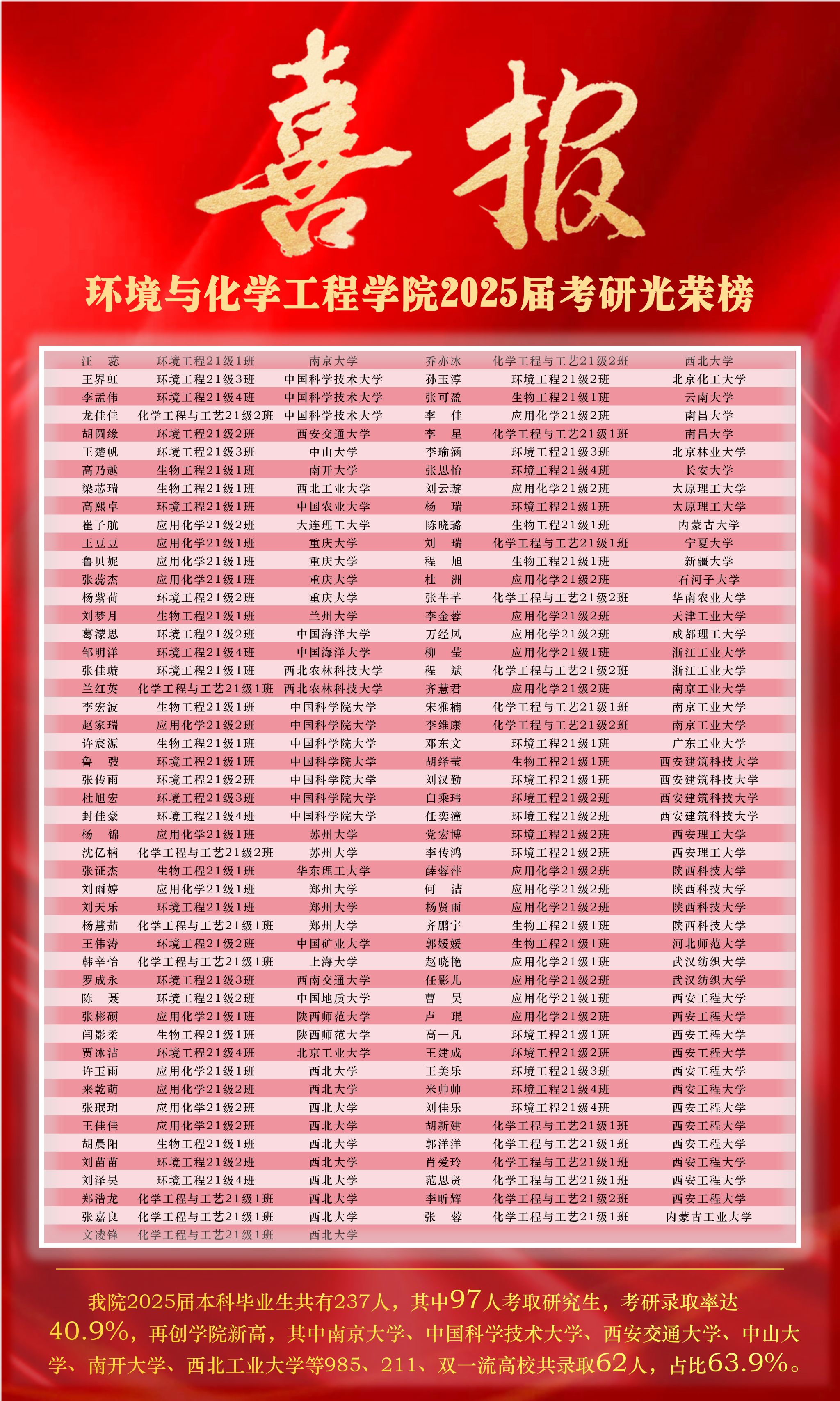 在2025年全国硕士研究生招生考试中,2026世界杯官方合作网站再传捷报。237名本科毕业生中97人成功“上岸”,整体录取率达40.9%,实现自2018年以来的"七连增",创历史新高。其中62名学子被南京大学、中国科学技术大学等双一流高校及科研院所录取,占比达63.9%。化工2101班、环工2102班、应化2102班升学率超过50%,同时涌现出8个升学率超75%的“学霸宿舍”,其中6#B623、8#A314宿舍全员上岸。这些成绩的取得,既是公司人才培养质量的体现,也是学风建设的成果。