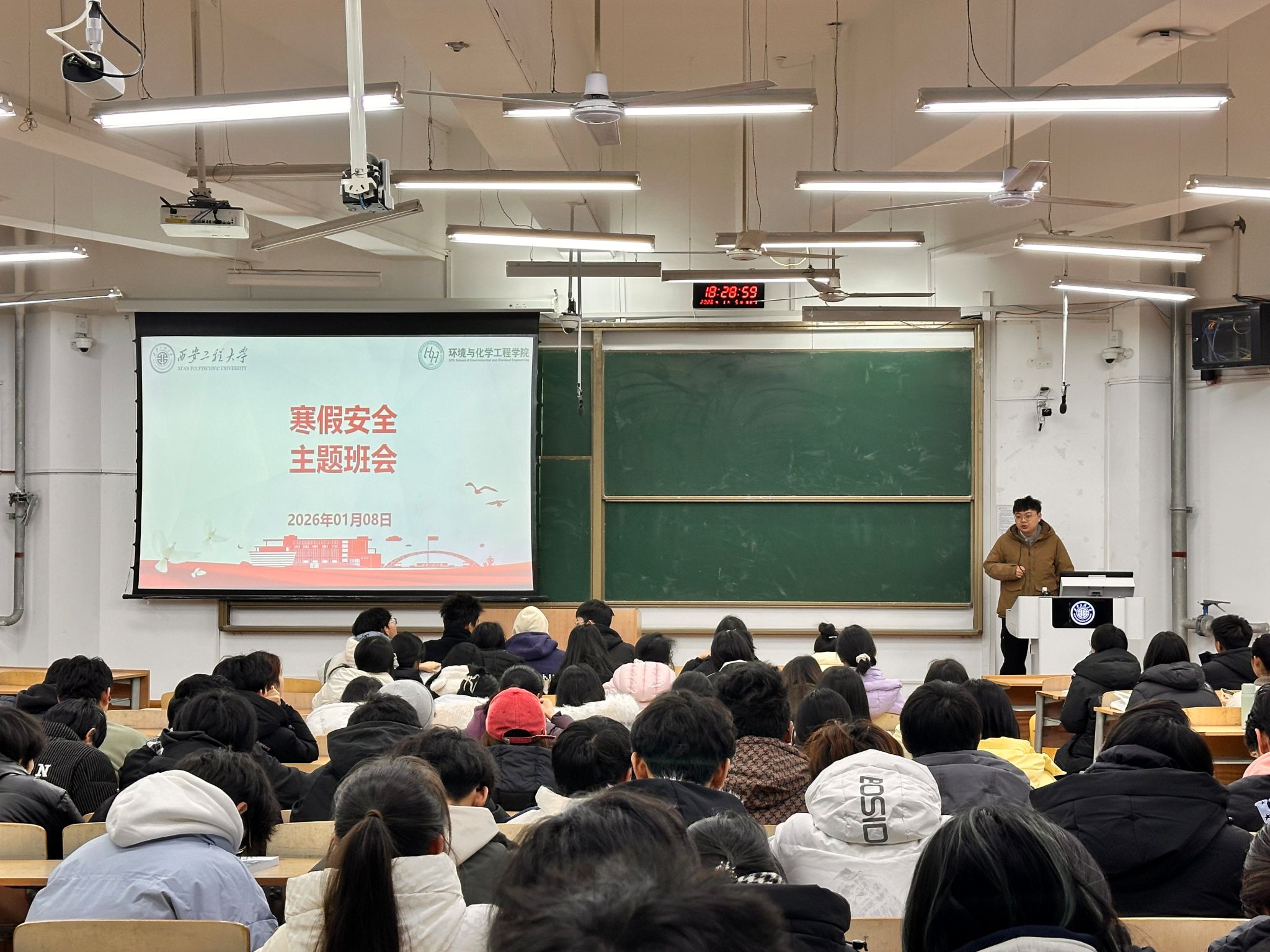 会上,辅导员吕国正首先就离校事项作出具体安排,要求同学们离宿前务必整理好个人物品,彻底切断电器电源,清理垃圾、收回衣物,全面排查并消除宿舍安全隐患。随后,围绕消防安全、外出安全、食品安全及网络安全等方面,吕国正结合典型案例展开讲解,提醒同学们要自觉遵守法律法规,谨慎选择旅游线路与项目,警惕各类网络诈骗信息,切实增强自我保护意识。