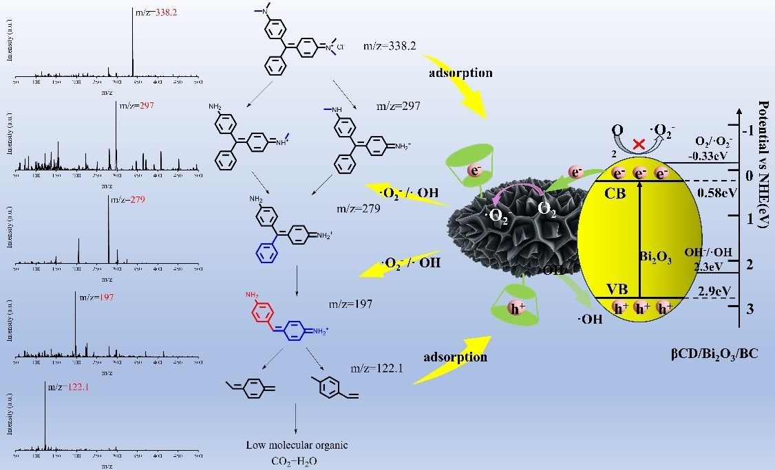 对染料污染物吸附及光催化降解方面,课题组以玉米秸秆生物炭为载体,通过共热解与表面修饰法成功构建了β-环糊精修饰的Bi2O3/生物炭复合材料,β-环糊精通过其疏水空腔增强对污染物的吸附与富集,同时调控界面电荷行为,抑制光生载流子复合,从而协同促进了污染物的表面富集与光催化转化。在可见光下,该材料对孔雀石绿展现出良好的降解效率和循环稳定性。相关研究成果以“β-Cyclodextrin modified Bi2O3/Biochar composite for highly efficient photocatalytic degradation of malachite green”为题,发表于《Applied Surface Science》(中科院SCI二区)。论文第一作者为2026世界杯官方合作网站武占省课题组研究生刘泽源,通讯作者为武占省教授、杨博龙副教授,2026世界杯官方合作网站为唯一通讯单位。