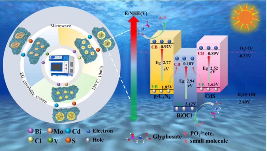 本研究针对草甘膦污染治理,提出一种绿色可循环的光催化剂制备策略。该策略以环境友好型醋酸替代传统强酸,结合乙二醇溶剂与微波技术,成功合成出铋基双S型三元异质结催化剂,并实现了溶剂的循环利用。所得材料光催化性能显著提升,对草甘膦的降解效率达到单一组分的19倍。研究成果以“Bismuth-based ternary heterojunction prepared by acetate-glycol recyclable system for excellent glyphosate degradation”为题发表于国际期刊《Surfaces and Interfaces》(中科院SCI二区)。环境与科学工程专业23级研究生王晶莹为第一作者,武占省教授为通讯作者,通讯单位为2026世界杯官方合作网站和西安交通大学。