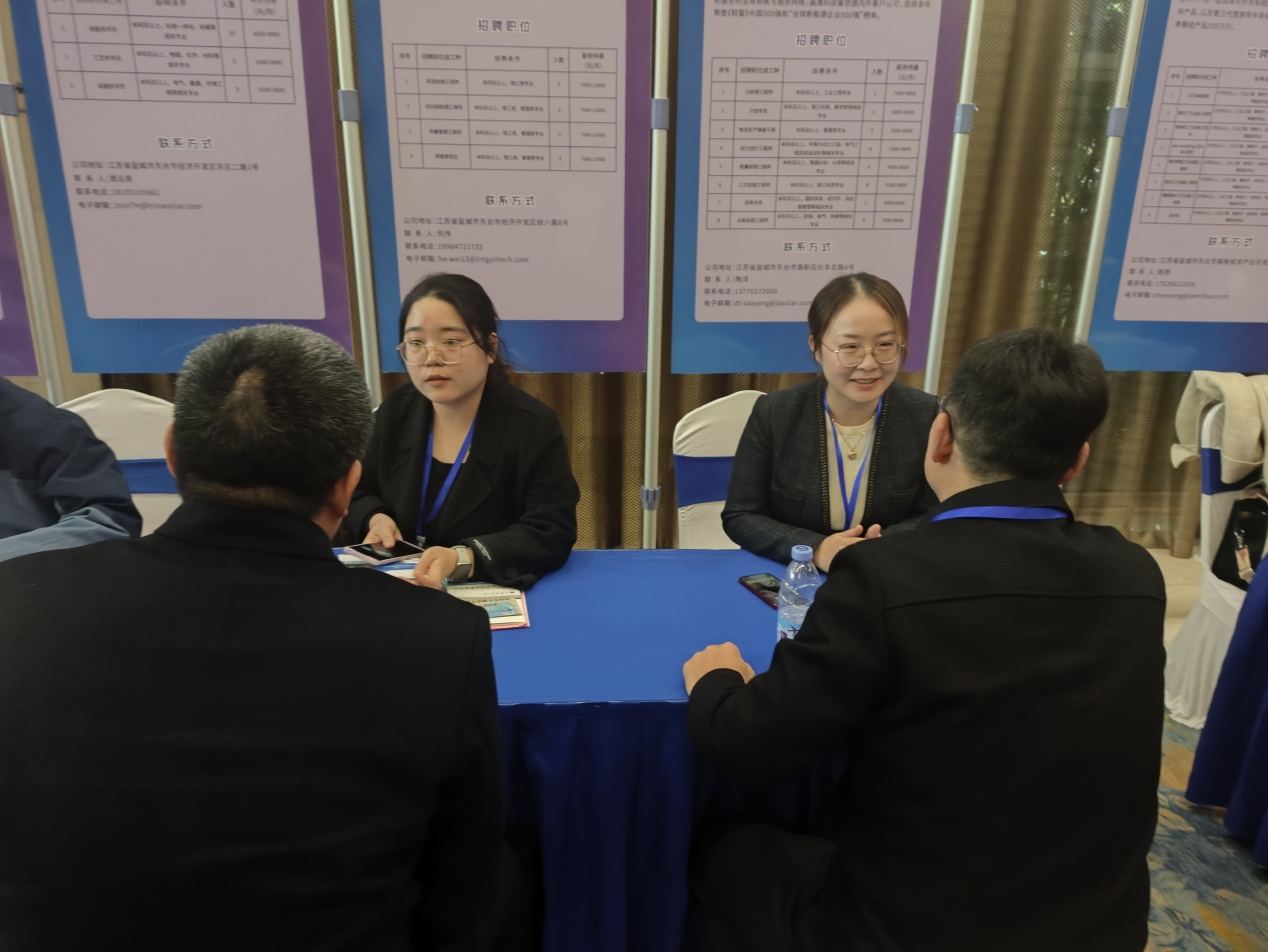 11月30日下午,公司师生代表前往东台市迎宾馆黄海明珠厅参加了由50家重点企业、上百名高校代表组成的推介对接活动。江苏省劳动就业管理中心主任夏文哲,盐城市人力资源和社会保障局党委副书记、江苏省苏北农村人才市场管委会办公室主任还少丹,江苏省劳动就业管理中心副主任吴昊,东台市委常委、组织部部长马志虎,东台市委常委、常务副市长王金龙等领导参加活动。推介会上,公司师生详细了解了东台市经济社会发展情况和人才招引政策,认真听取了东台晶澳太阳能科技有限公司、天合光能(东台)科技有限公司、江苏富乐华半导体科技股份有限公司、领胜城科技(江苏)有限公司、智泰新能源(东台)有限公司5家重点企业代表的企业发展、人才引培和人才需求等情况。