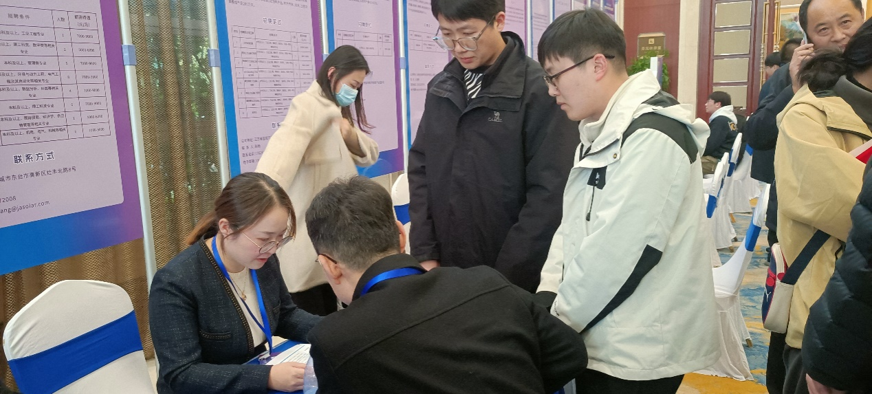 推介会校企对接启动仪式后,公司党委书记胡西民以及两名员工代表与东台市50家重点企业面对面对接,洽谈人才用工需求,向各重点企业发放公司毕业生情况并邀请各大企业来公司面对面对接人才用工,为公司毕业生提供更多的就业机会。对接会上,公司党委书记胡西民与晶澳太阳能人力资源部经理王舒进行了有关校企合作、本硕毕业生就业方向、人才用工等方面的深入交流,表达了在未来与晶澳太阳能有更深、更广的合作意愿。