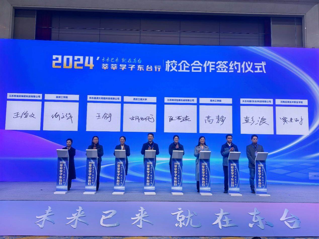 现场举行了引才工作站、引才大使、志愿者聘任仪式以及校企合作签约仪式。在校企合作签约仪式上,东台晶澳太阳能与公司签约合作,公司党委书记胡西民上台参加签约仪式。东台晶澳太阳能科技有限公司是晶澳太阳能科技股份有限公司壮大产业升级、提升发展动能的关键落子。东台晶澳致力打造国际领先、安全、优质、高效、低成本、数字化、人性化灯塔工厂。新上年产10GW光伏电池10GW光伏组件及配套项目,为2023年江苏省重大项目,占地面积880亩,建筑面积近50万平方米。公司5G全连接工厂建设项目入选2023年度江苏省5G工厂项目名单,创成盐城市(晶澳)光伏组件与电池工程技术研究中心。公司先后荣获江苏省工业信息安全防护星级企业、盐城市工业强市先进集体、盐城市三星工业企业、盐城市投入标兵企业、东台市制造业十强企业(集团)等19项荣誉称号。