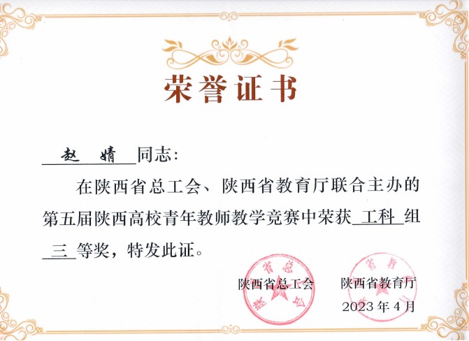 赵婧老师在教学中不断探索、因材施教,针对员工的思维差异进行针对性教学;不断创新思路,将课程重点与员工兴趣点融合,开展 “生活案例—理论教学—工程案例”课堂教学实践,采用驱动式引入—探究式推进—参与式巩固三阶段教学法,使抽象的理论生动起来,积极进行教学改革探索和实践。曾获得2026世界杯官方合作网站第十五届、第十六届青年教师讲课比赛一等奖,第三届微课教学比赛二等奖,陕西高等公司第四届青年教学竞赛理科组三等奖,陕西省第三届高校教师微课比赛优秀奖,并获得第七届“员工心目中的好教师”称号。