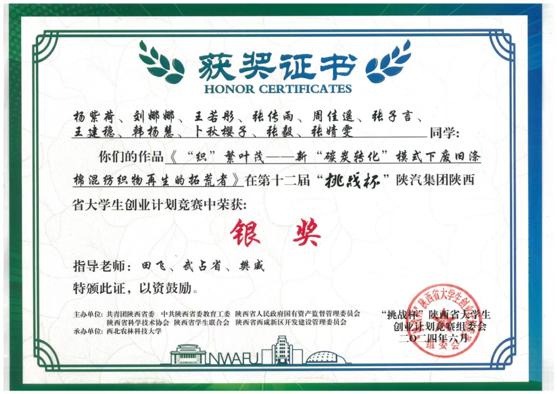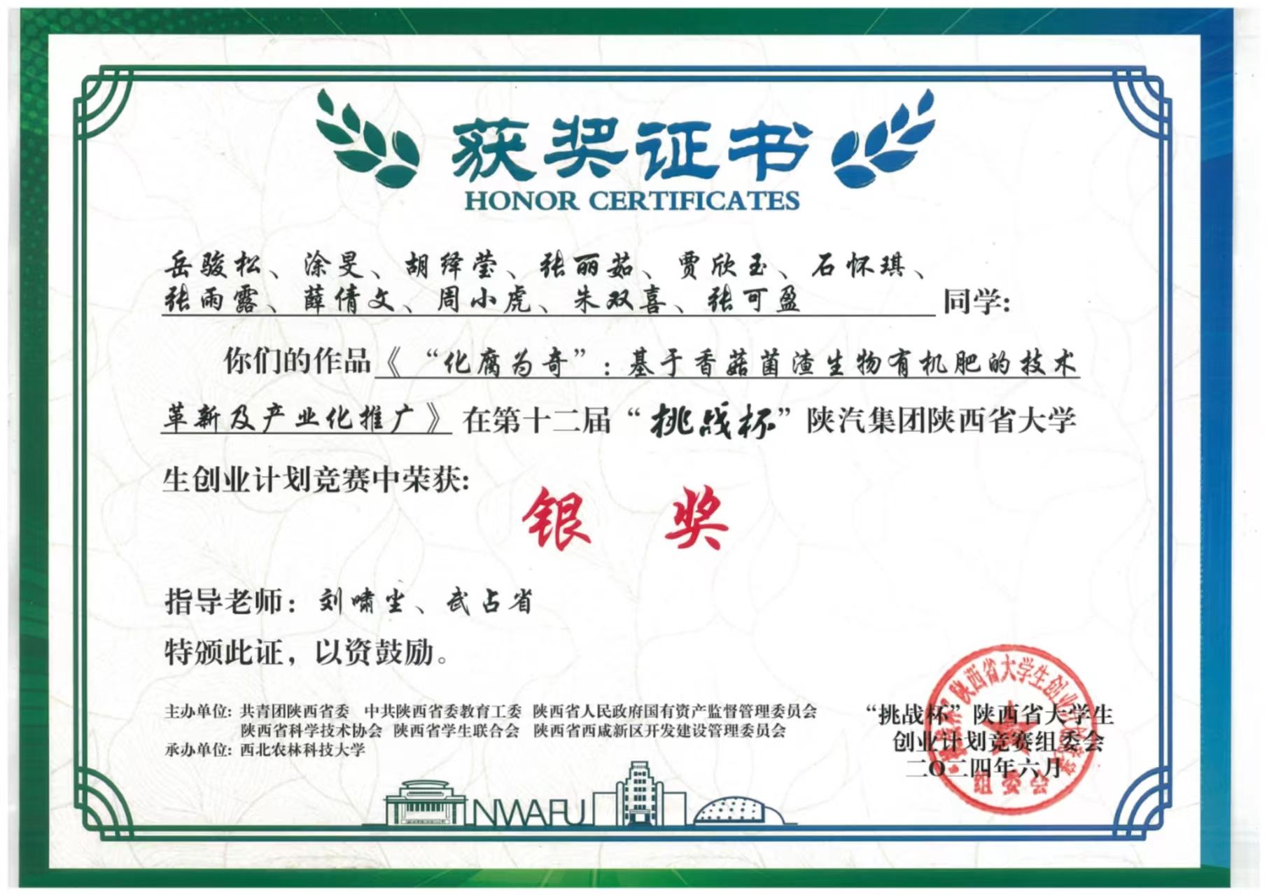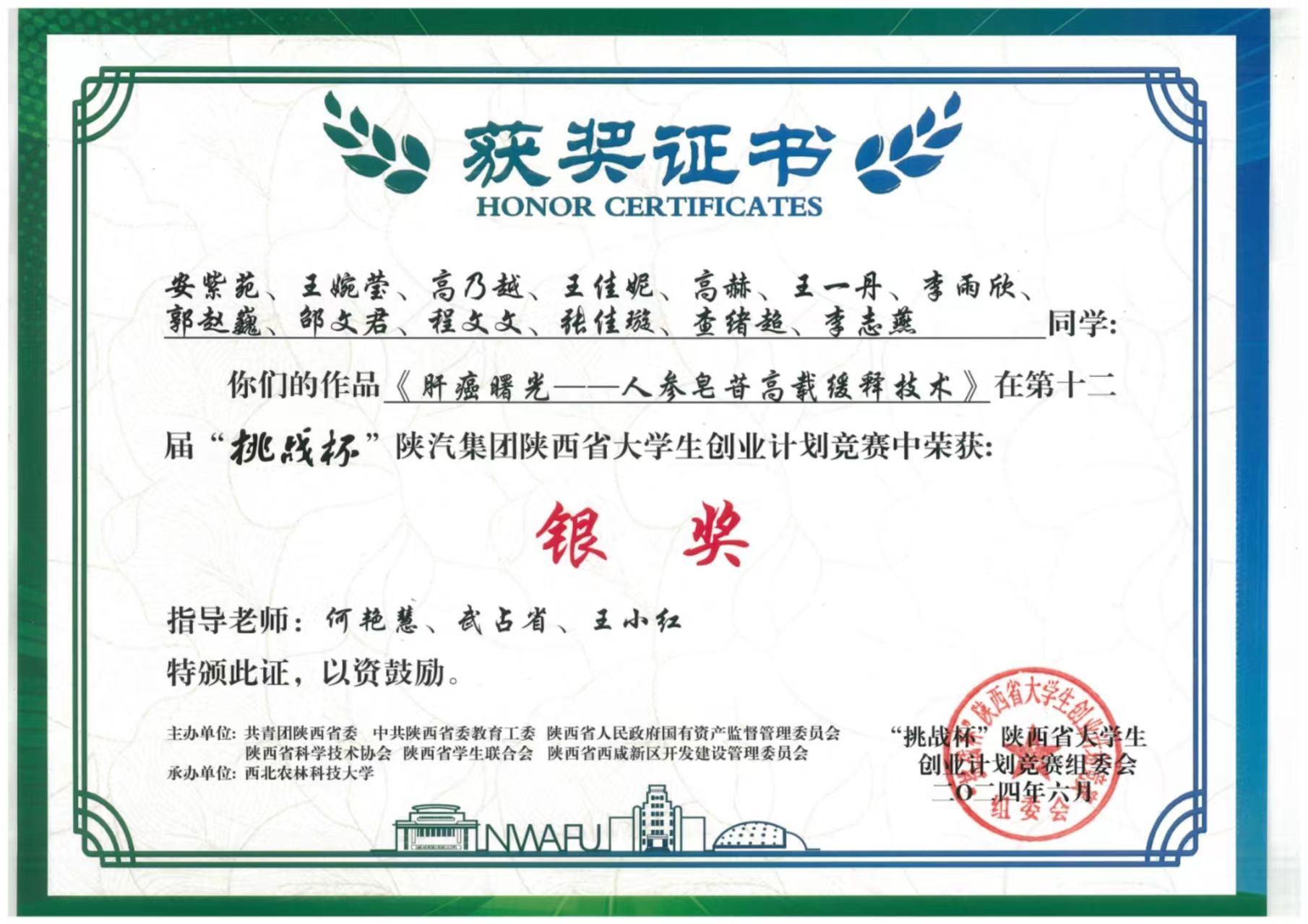 6月7日,第十二届“挑战杯”陕汽集团陕西省老员工创业计划竞赛闭幕式暨颁奖仪式于西北农林科技大学举行。公司4个项目进入决赛,均获得银奖,实现了获奖数量的突破。