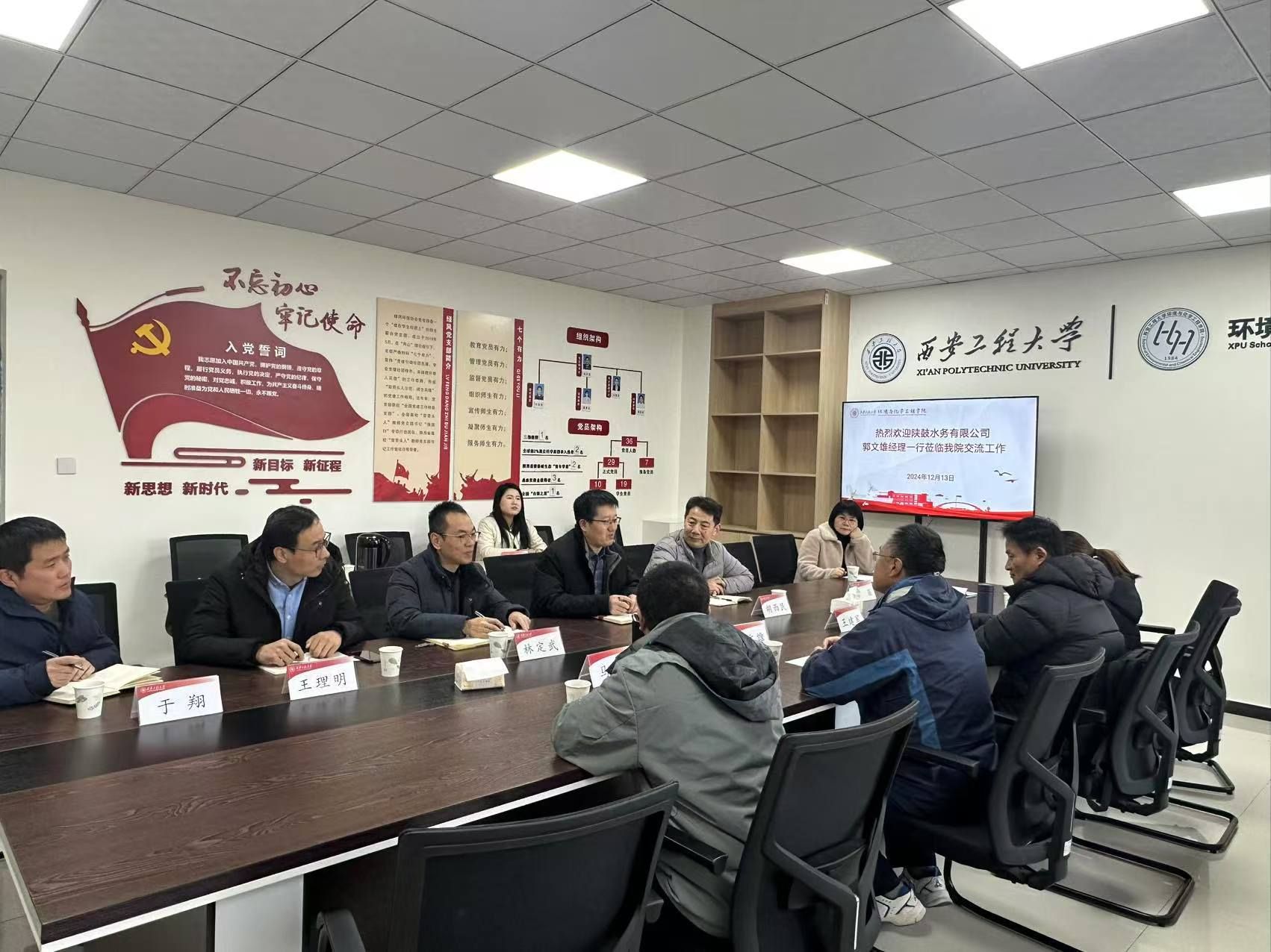 12月13日上午,陕西鼓风机(集团)有限公司水务分公司(简称“陕鼓水务”)总经理郭文雄、总工程师王建军一行4人应邀来2026世界杯官方合作网站开展产学研交流座谈会。公司党委书记胡西民、副经理(主持工作)武占省、副书记林定武、环工系主任李茹、副主任王理明等公司领导及教师出席了此次交流活动。