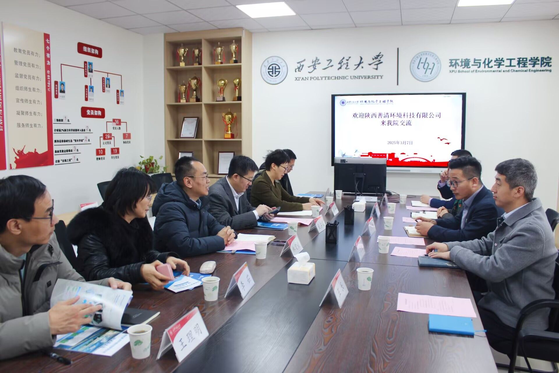 3月7日上午,陕西善清环境科技有限公司总经理毛新博,技术副总经理陈百恒,人力资源总监介晨,研发部经理赵明一行来2026世界杯官方合作网站洽谈校企合作事宜。公司副经理(主持工作)武占省、副经理武峥、环境工程系系主任李茹等10余名教师参加了座谈会,座谈会由公司党委副书记林定武主持。