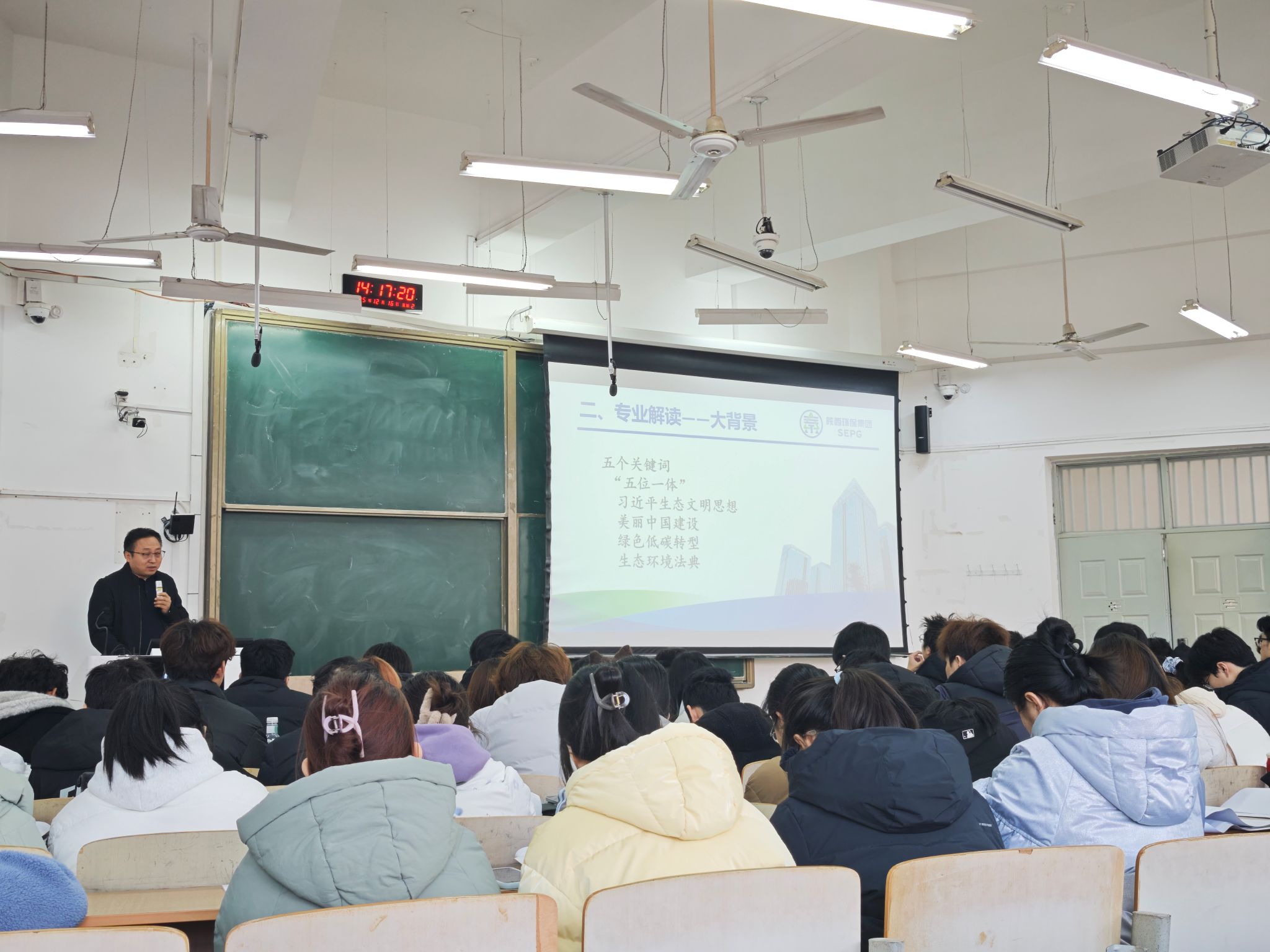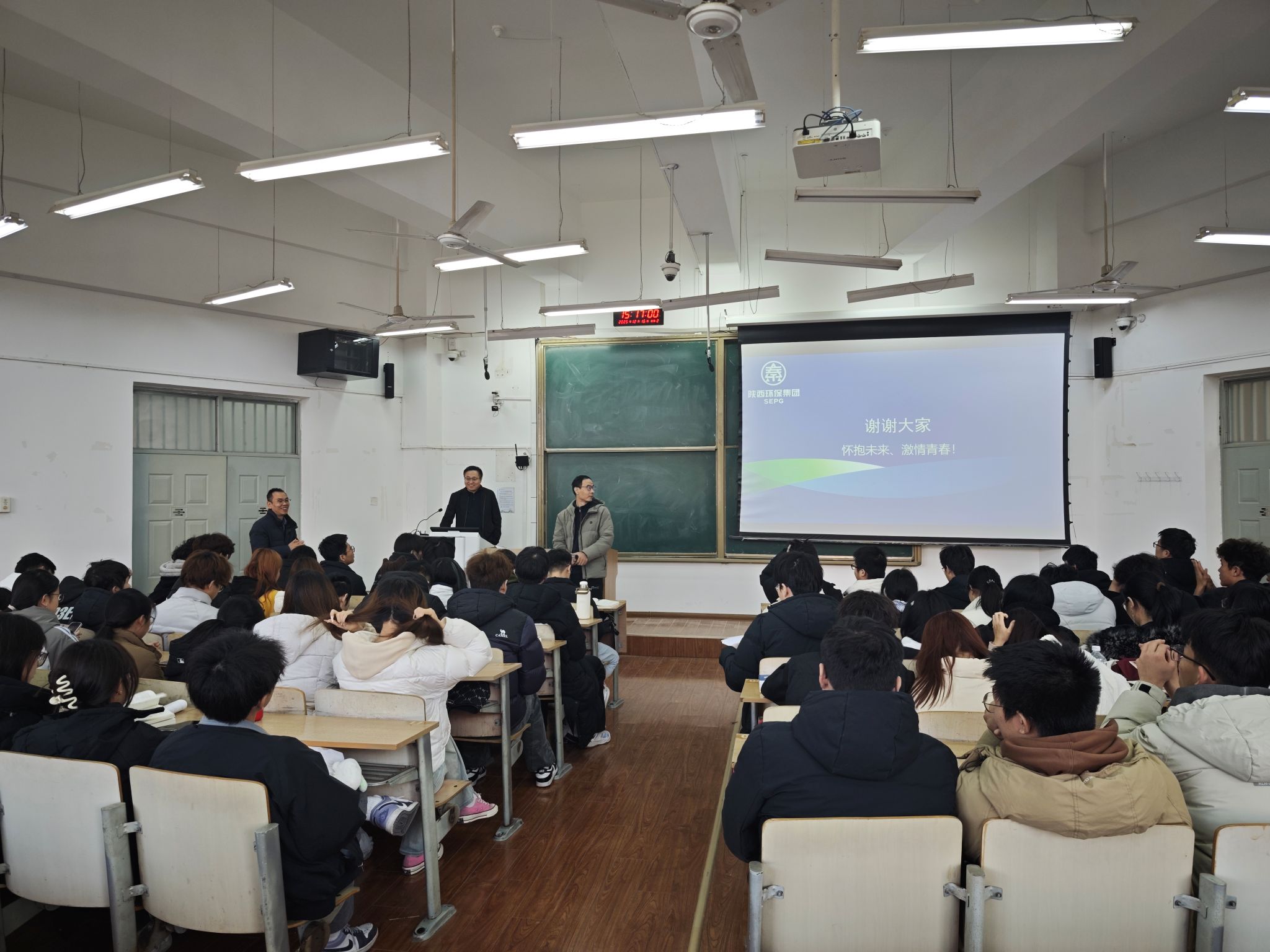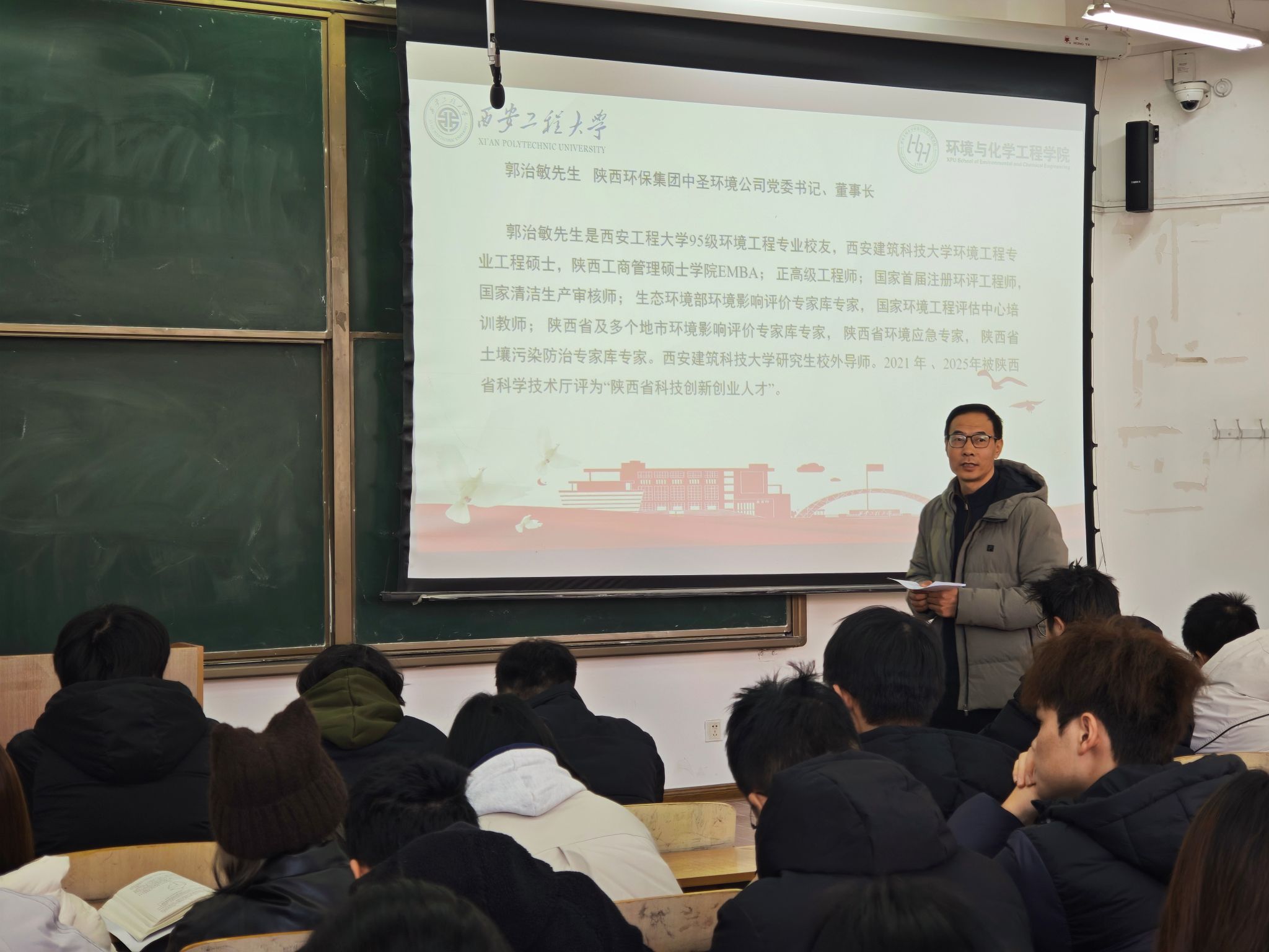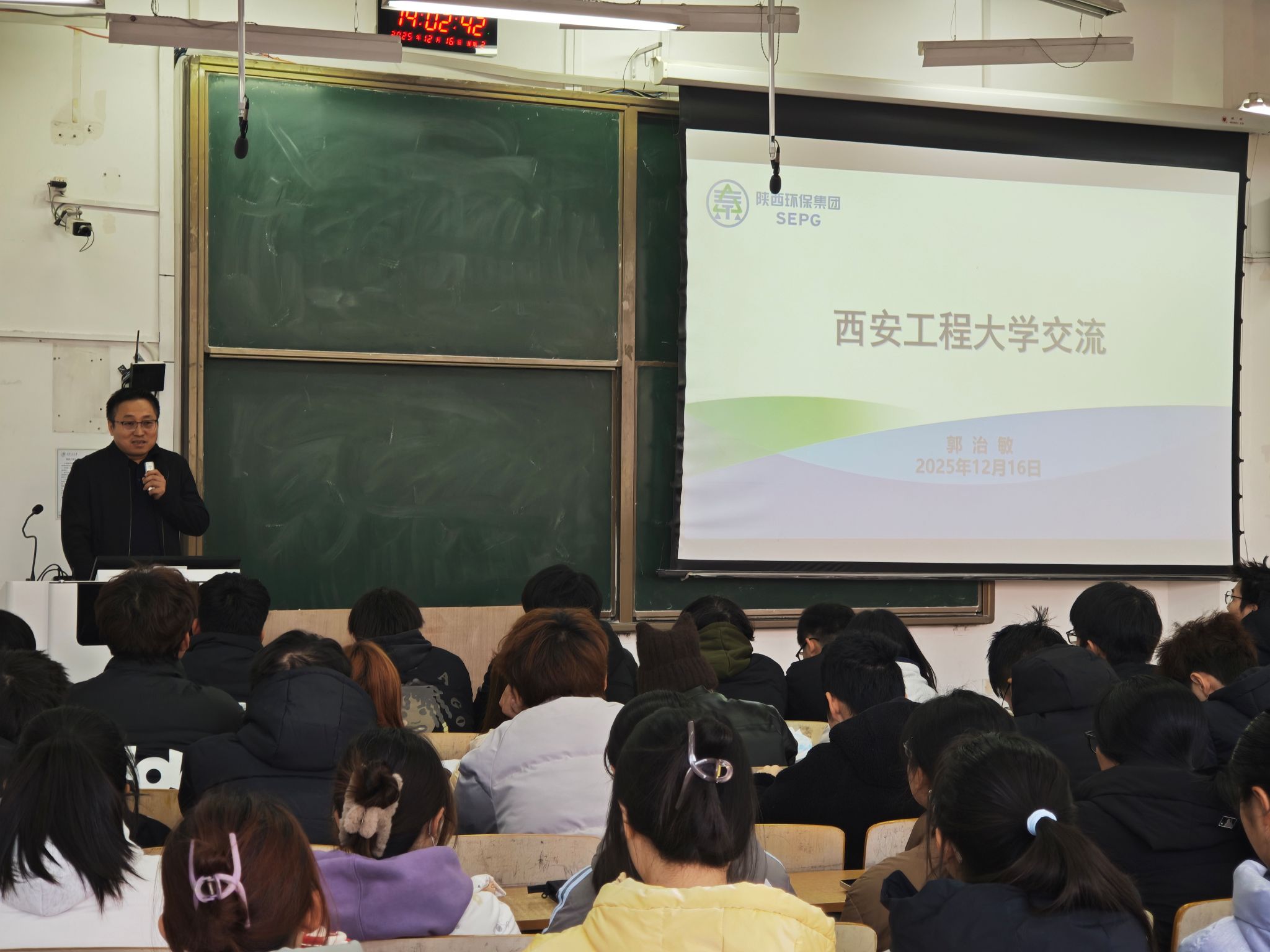 12月16日,公司第十九期“绿风·环化论坛”于临潼校区教学楼B135教室圆满举行。本次论坛特邀陕西环保集团中圣环境公司党委书记、董事长、公司95级环境工程专业员工郭治敏先生重返母校,以“人生·专业·未来”为主题,为2025级环境工程专业员工带来了一场内涵深刻、视野开阔的专题报告。公司党委副书记林定武、2025级辅导员吕国正出席活动,报告会由环境科学与工程系副主任王理明主持。